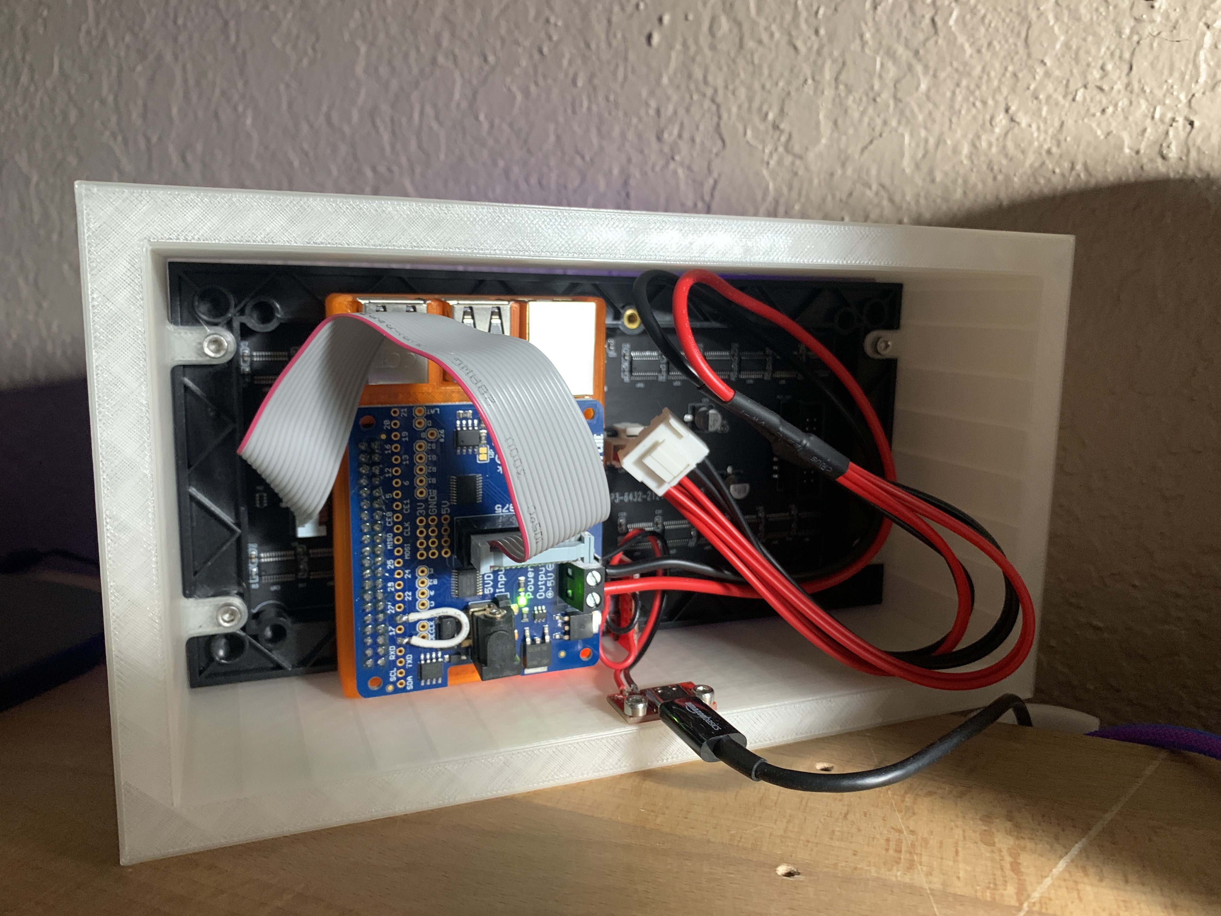 The setup is intended for a Raspberry Pi, specifically a 3B+ model, and requires the use of an Adafruit RGB Matrix HAT, a 5V power supply, and a 64x32 RGB LED Matrix, P3. The project leverages the rpi-rgb-led-matrix library by hzeller. The system consists of two applications that have been dockerized for ease of testing and deployment. Both the app and API directories have their own Dockerfile, allowing them to be built and run separately if needed. The web application is built on React. The API is built simply from Flask, providing a Python basis for the API which allows for easy integration into the LED driver library.
